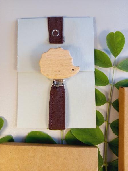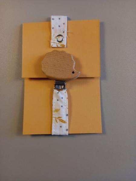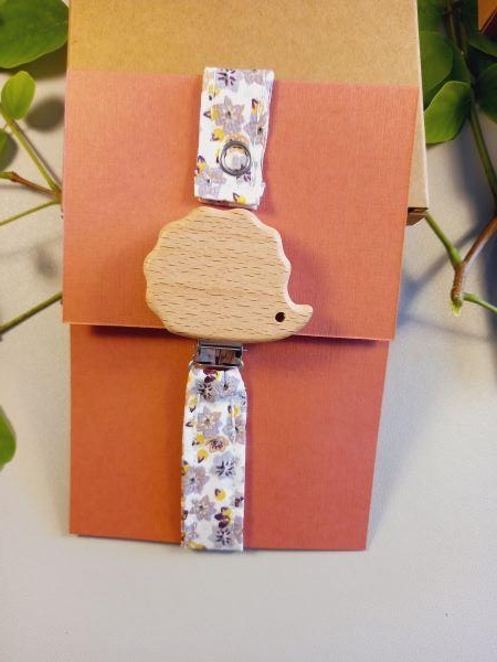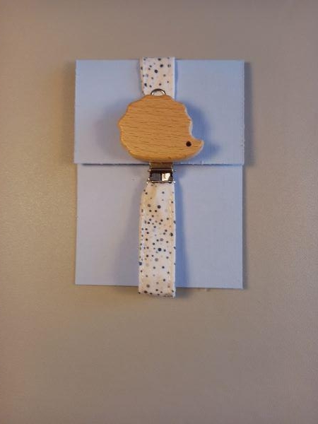 Le hérisson en bois tendre mesure 3 cm et la longueur totale est de 23 cm lorsque le lien est refermé sur l'anneau de la tétine